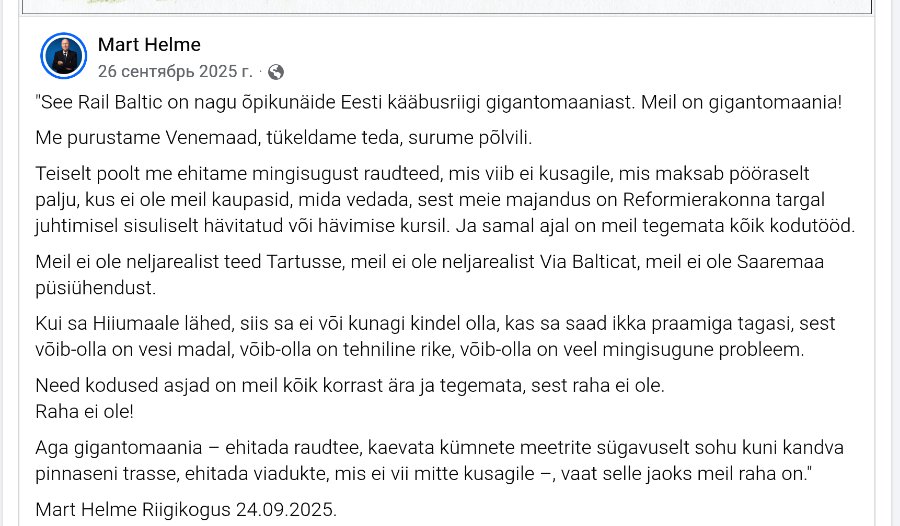 «Этот Rail Baltic — как хрестоматийный пример гигантомании эстонского карликового государства. У нас гигантомания!