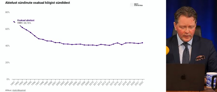 У рождаемости всегда были периоды подъема и спада... Ну, давайте проверим по эстонской статистике, каков этот суммарный коэффициент рождаемости. То есть среднее количество рожденных детей на женщину фертильного возраста в последние годы, а фактически за весь период восстановления независимости. Я уже упоминал, что он всегда был ниже уровня воспроизводства. Если мы пойдем с 1991 года, то это 1,8, что, конечно, ниже уровня воспроизводства. Затем в следующем году уже 1,71, падает в наши «плодотворные» ранние годы независимости до 1,49. Далее в последующие годы до 1,38 в 1995 году, пока не достигает абсолютного минимума 1,28 в 1998 году. Затем начинает потихоньку расти, так как в это время ввели родительскую зарплату, хотя и не достигает уровня воспроизводства 2,1 ребенка на женщину. Здесь даже в период подъема было только 1,72 в 2009 году и 1,72 снова в 2010 году. Затем идет тренд на снижение, и в 2022 году достигает показателя 1,41. И, как уже упоминалось, в прошлом году коэффициент рождаемости упал после этого периода постоянных отрицательных рекордов до 1,18, что является просто драстическим падением. То есть фактически за период восстановления независимости — эта статистика заканчивается 2022 годом, но и далее — мы вышли на самый низкий показатель коэффициента рождаемости. И, очевидно, тот год, который еще не учтен, 2025-й, только что прошедший, будет еще ниже.
