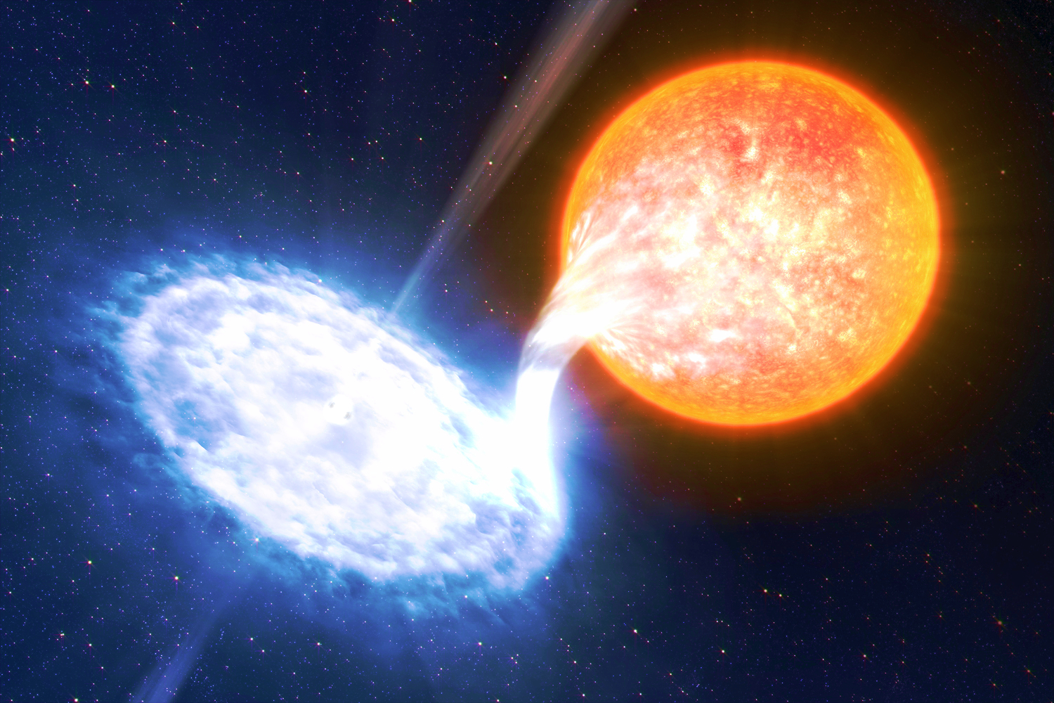 Начнем с того, что такие явления происходят в системах тесных двойных звезд - где две довольно массивные звезды обращаются вокруг общего центра масс на довольно близком по космическим масштабам расстоянии. При этом одна из звезд - стареющий, "пухлый и рыхлый" красный гигант, весьма прохладный для средних звездных температур поверхности, а рядом с ним - белый карлик - звезда уже полностью сгоревшая изнутри - выработавшая весь свой водородный ресурс, сжавшаяся до компактных размеров, но обладающая при этом значительной массой. Вот этой своей массой - своей гравитацией - белый карлик перетягивает "рыхлое" вещество внешних слоев своего соседа - красного гиганта - пользуясь близостью, а во внешних слоях красного гиганта еще достаточно водорода, который для каждой звезды является тем термоядерным топливом, за счет которого любая звезда живет, а без него - медленно умирает.