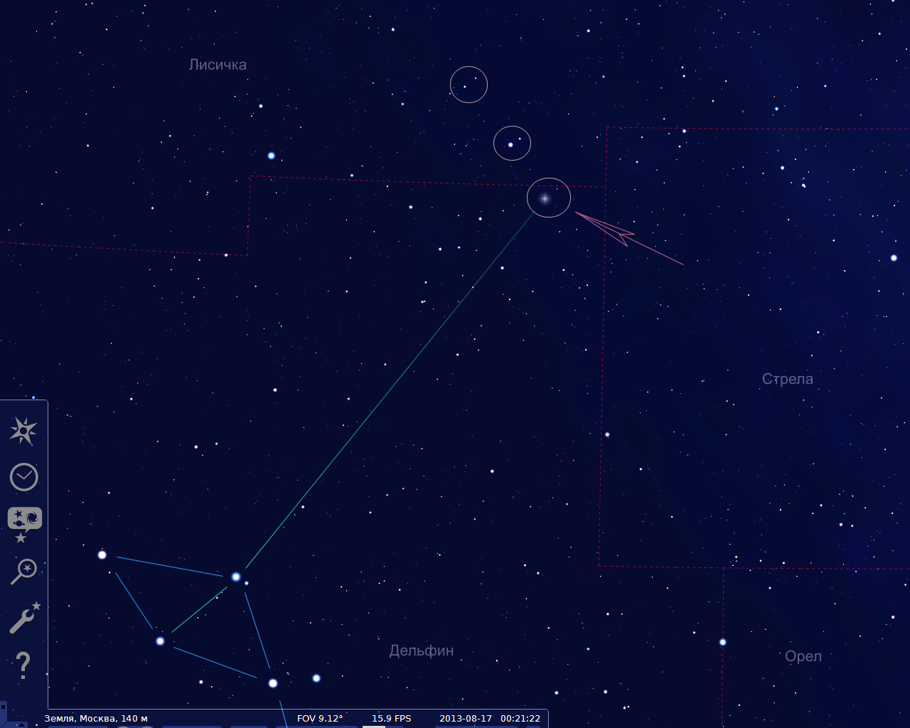 Этот самый ромбик из четырех, быть может не очень ярких, но все же отчетливо видимых даже на московском небе, звезд, нам как раз и нужен. Если пролить линию "вверх" (а точнее на северо-запад) по короткой диагонали этого ромба (называемого еще "Головой Дельфина") и отложить на этой линии приблизительно 5-кратное расстояние между теми звездами, что расположены на концах этой короткой диагонали, то мы как раз и попадем в тот район неба, где на границе созвездий Дельфина, Лисички и Стрелы вспыхнула Новая звезда.