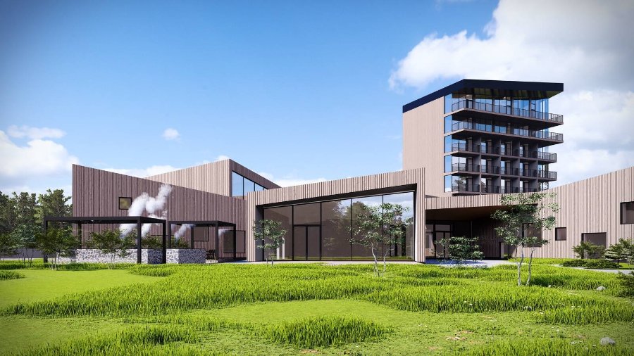 Эскиз спа-отеля, который Nordecon AS и Embach Ehitus OÜ планируют достроить во второй половине лета 2026 года. Foto: Киллу Майдла / DV.ee