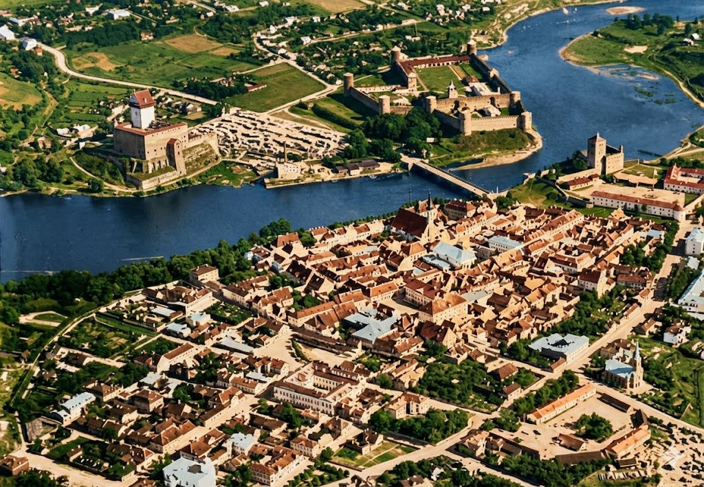 1930-е годы. Аэрофотосъемка центра Нарвы. Улучшено ИИ. Источник: государственный фотоархив Эстонии