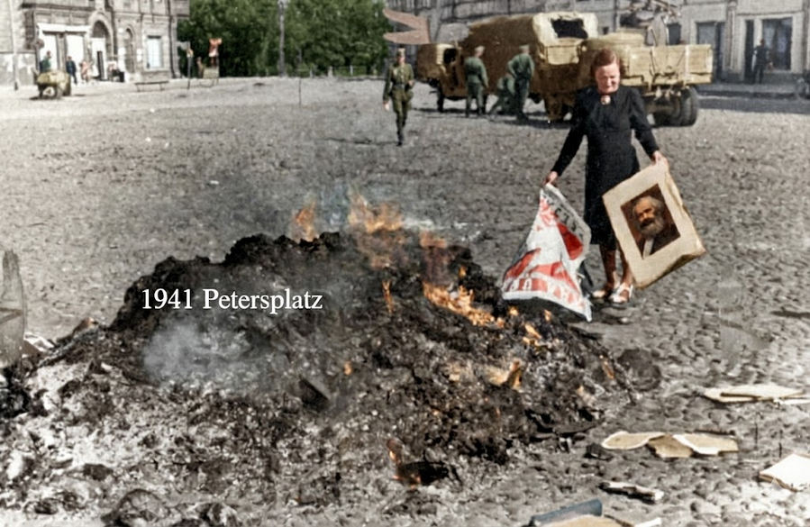 1941 год. Петровская площадь после оккупации города немецкими войсками. Источник: Facebook / Колоризцация: ИИ