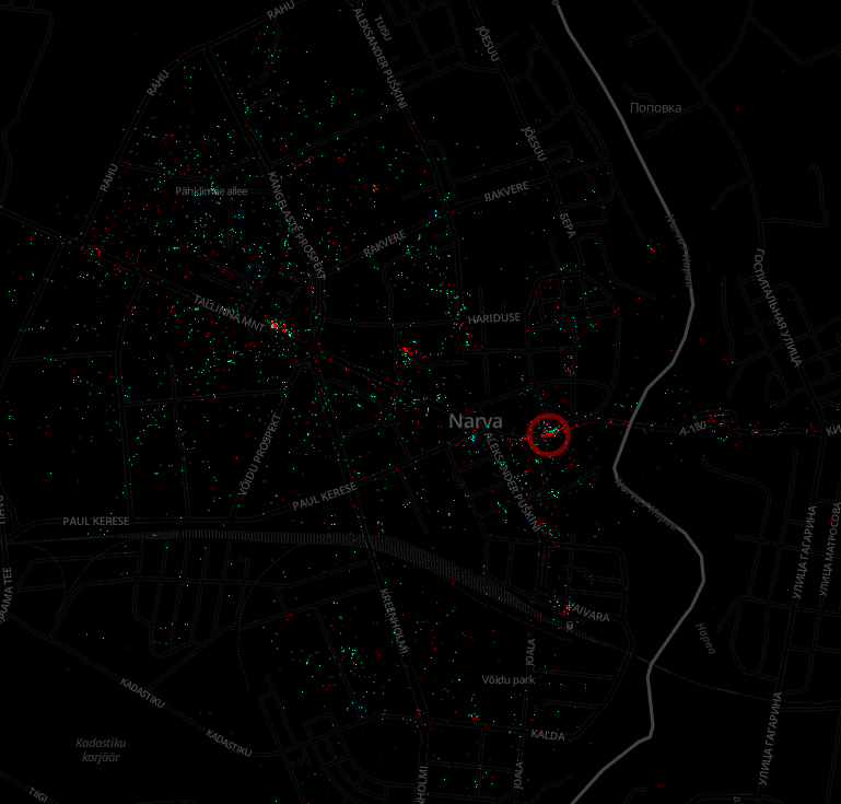 В Нарве больше устройств на Андройде, но есть заметное скопление "яблочников" в районе Петровской площади (см. далее). Туристы или работники горуправы повлияли на эти показатели, науке это не известно