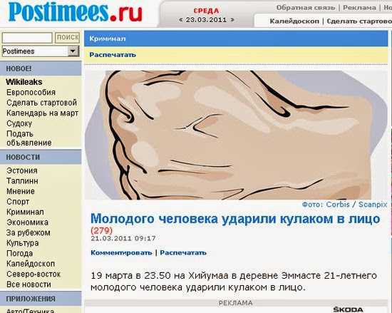 Все наверно помнят криминальную новость Постимеес о том, что на Хийумаа ударили человека в лицо? (кто не вспомнил, см. далее) Картинка с этой новостью тогда облетела весь Рунет, доставив много радости русскоязычной части Интернета. Вчера на страницах упомянутой газеты появилась и уже разлетелась по миру новая причина улыбнуться.