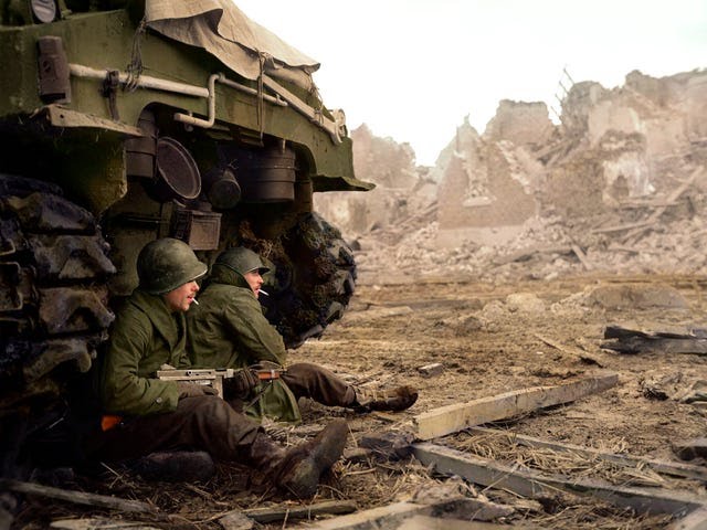 Солдаты 9-й пехотной дивизии на улицах немецкого города.